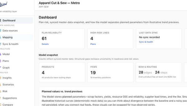 Reliow sits on top of existing planning systems to evaluate how production plans perform under real-world variability. It ingests operational data and plans, analyzes dependencies, identifies risk, and recommends targeted interventions to improve execution reliability and business outcomes.
